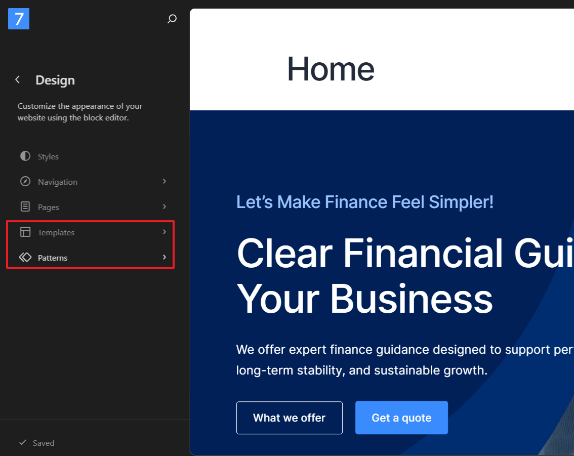 All of these layouts can also be accessed through Dashboard → Appearance → Editor, under the Patterns and Templates sections (fig. 4). You can also find options for editing Style (such as colors, fonts, and other design settings) directly under the Editor.
